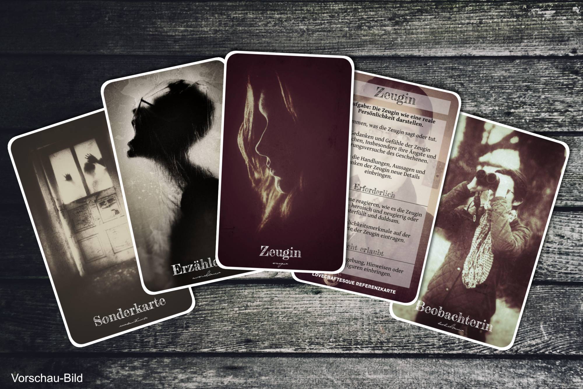 Sie erhalten ein vollfarbiges, gedrucktes Spielkartenset mit alternativer Bebilderung (abweichend vom Buch) der 20 Sonderkarten und 4 Referenzkarten. Sie ermöglichen das Außerkraftsetzen von fundamentalen Anweisungen in Lovecraftesque. Zudem enthält das Set 5 X-Karten.