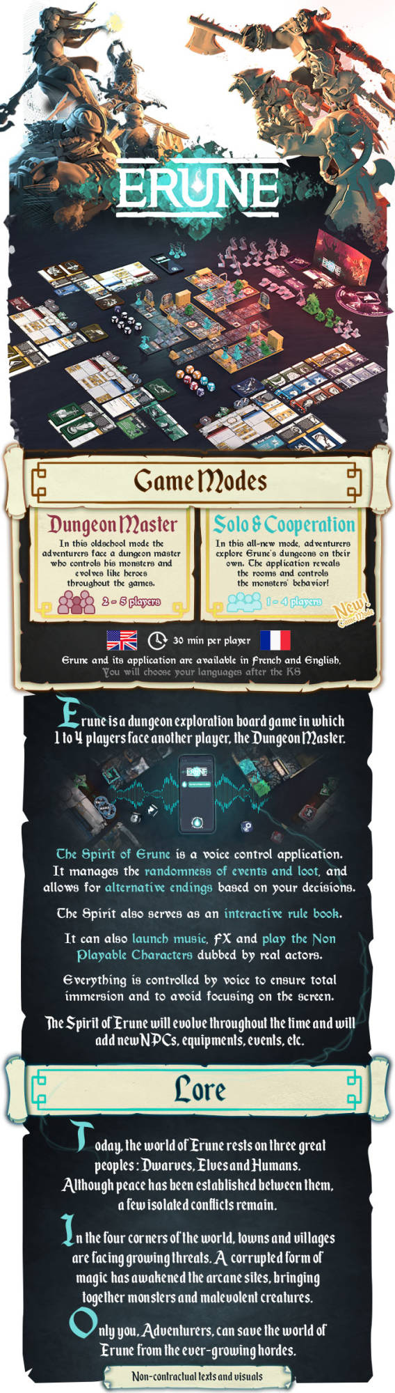 Being big fans of role-playing games, we make it a point of honor for ERUNE to be as immersive as possible. The voice application appeared as an obvious choice and allowed us to mix our Heroquest, Descent and all the great dungeon crawlers we particularly like with role-playing components, real randomness, impacting decisions, music, non-player characters dubbed by real actors in English and French, etc.