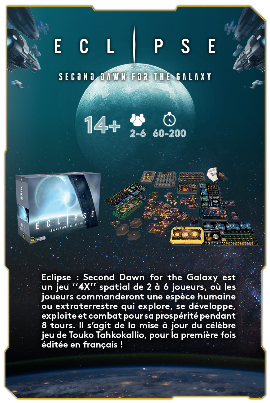 " Eclipse premier du nom était déjà un beau jeu, mais cette version est une perle ! Portée [...] par une équipe de passionnés, tout a été pensé pour la facilité de prise en main et le confort des joueurs! "