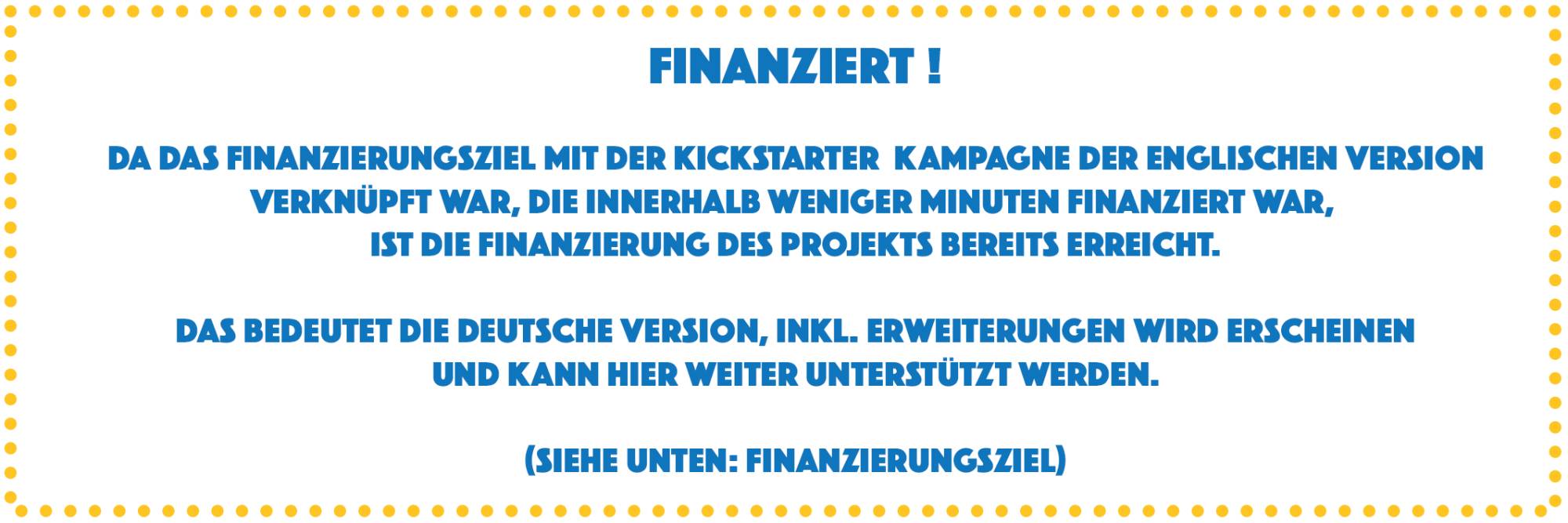 Zwischenzeitlich ist die Kickstarter Kampagne bereits erfolgreich verlaufen und die Finanzierung der Erweiterungen ist gesichert. Entsprechend haben wir das Finanzierungsziel für die deutsche Kampagne auf einen symbolischen Wert reduziert.