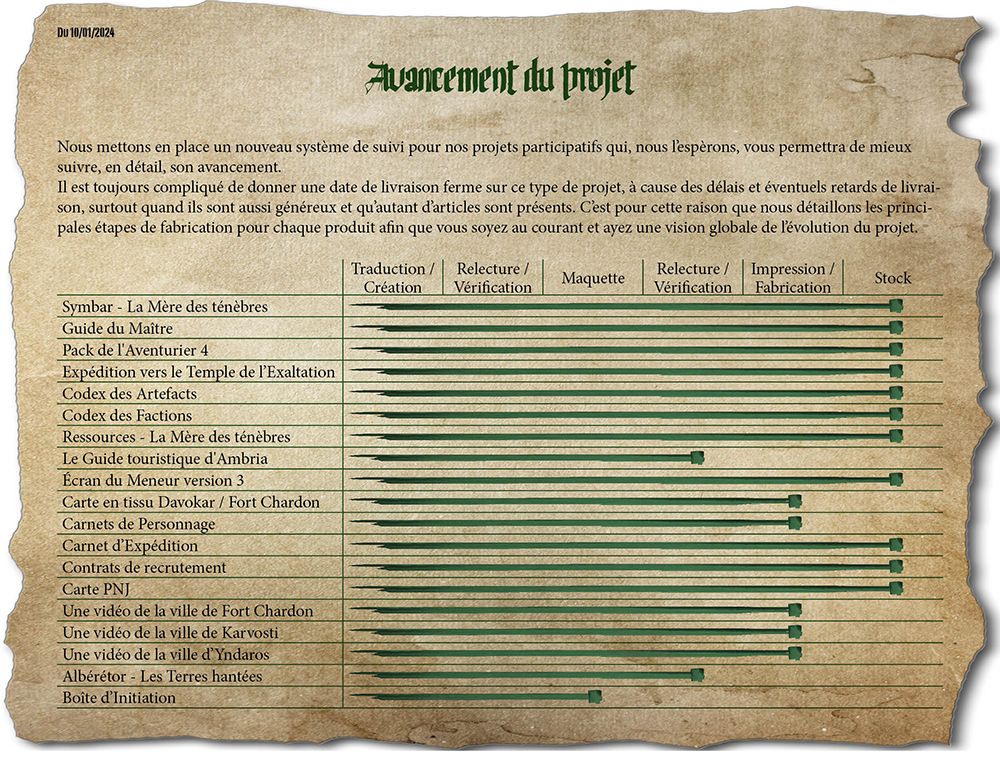 La PP de « Symbar - la Mère des Ténèbres » devrait être livrée courant janvier/février 2024 avec le cinquième volume de la campagne « Albérétor – Les Terres hantées ». Nous préférons compter ainsi à cause des fermetures des imprimeurs pour les fêtes de fin d’année.