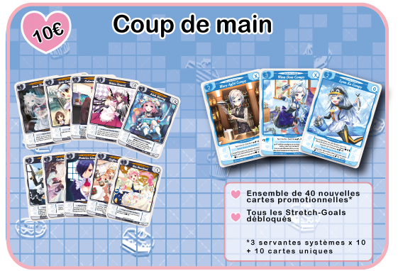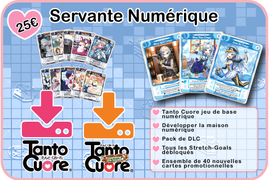 Mais ce n’est pas tout ! Nous avons de nouvelles cartes promotionnelles pour vous ! Chaque pledge de 25€ ou plus ne vous donne pas seulement le jeu de base Tanto Cuore Numérique et Développer la Maison Numérique à leur sortie, mais vous gagnerez aussi 40 VRAI cartes promotionnelles envoyées directement chez vous. Non seulement nous avons créé un nouvel ensemble de servantes pour la version numérique qui sera inclus sous forme de DLC exclusif pour nos Backers, mais il vous sera également envoyé directement chez vous avec toutes vos récompenses physiques dans les prochains mois.