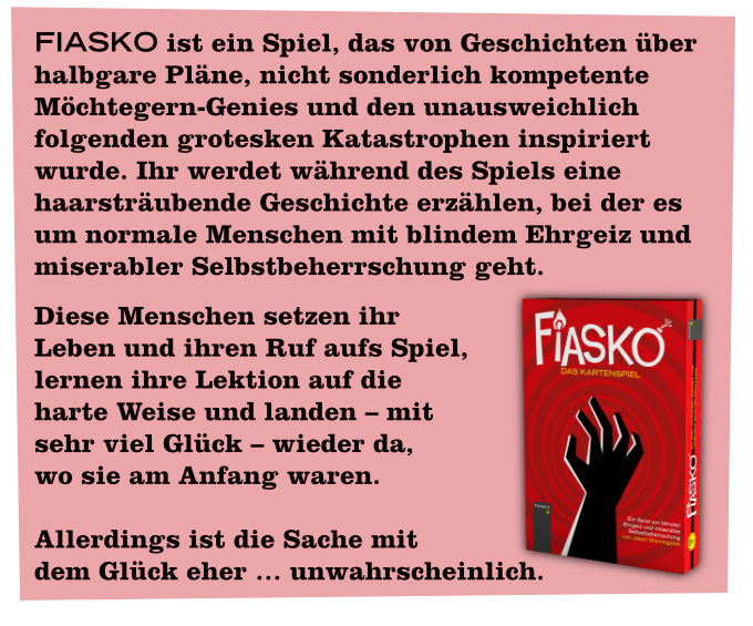 Fiasko ist ein witziges Erzählspiel für 3-5 Spielende ab 14 Jahren. Die Spieldauer beträgt ca. 2 Stunden. Das Ziel des Spiels ist es, gemeinsam eine unterhaltsame Geschichte über menschliches Versagen zu erzählen. Den Charakteren werden unweigerlich ziemlich schlimme Dinge passieren. Das Spiel funktioniert am besten, wenn ihr gemeinsam herausfindet, welcher Weg dabei der interessanteste ist!