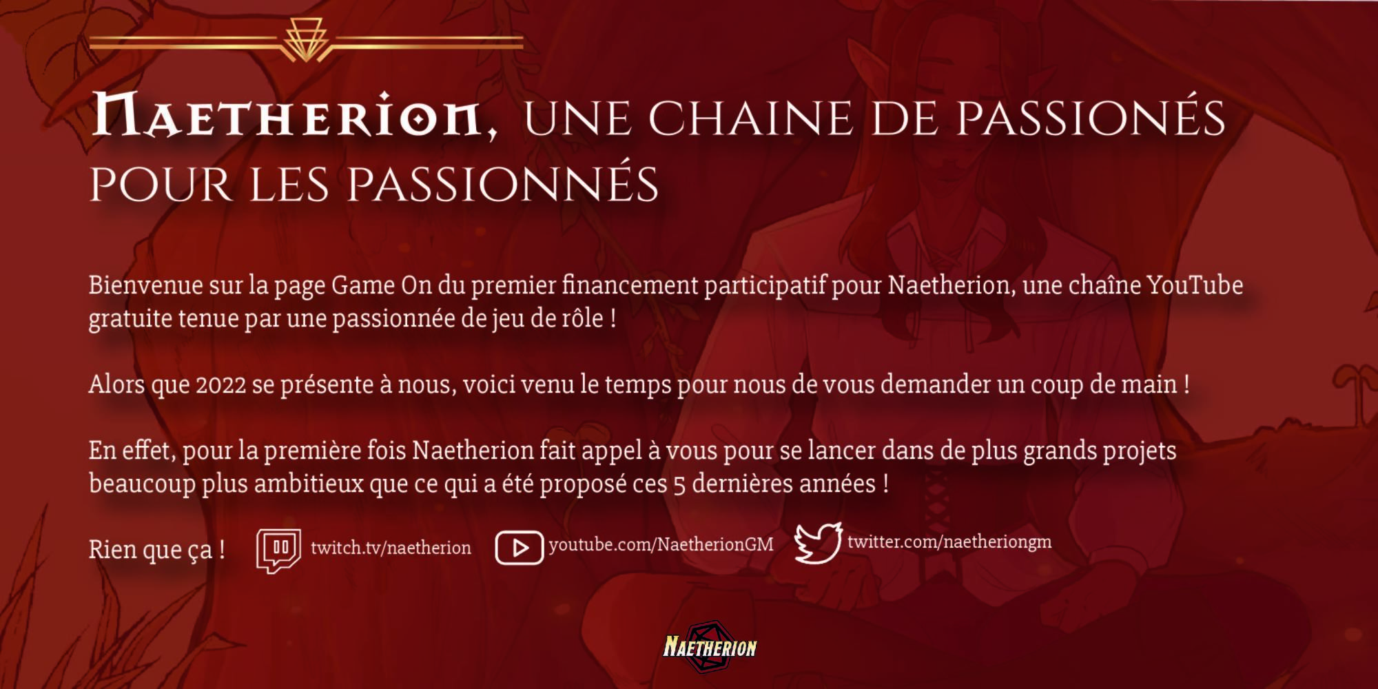 Naetherion c'est avant tout une personne passionnée par le jeu de rôle, qui lui consacre près de 15h par jour, qui cherche vraiment à donner une bonne image à ce hobby à travers ses projets et qui cherche à montrer au monde l'intérêt de sa pratique.