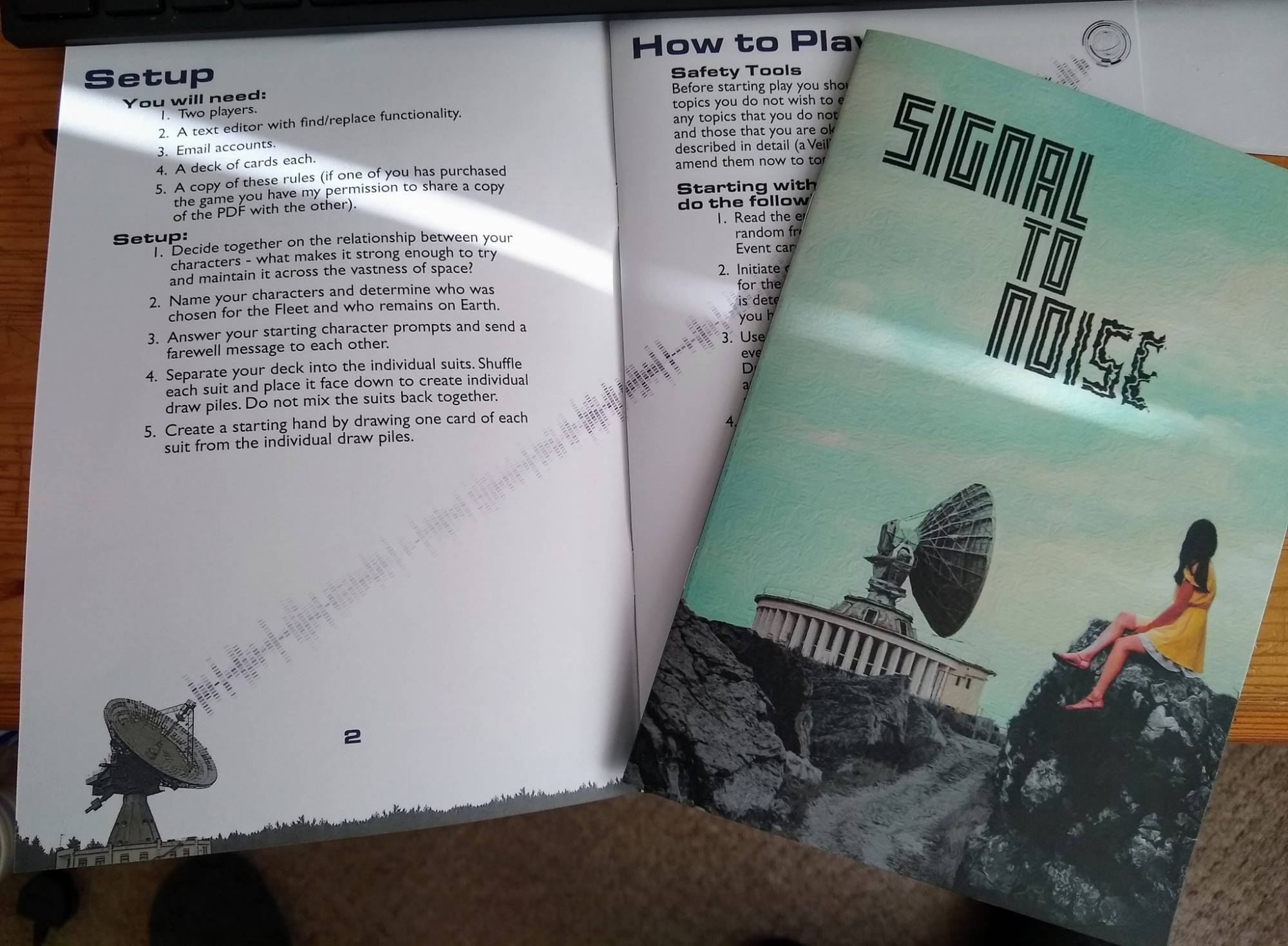 Signal to Noise will be available in print and digital formats. The current edition of the game is 24 pages in length and a successful campaign will fund an expanded page count. The game will be printed by Mixam in the UK with full-colour cover and black and white interior. Digital editions will be fulfilled directly through Game on Tabletop and via itch.io. The available reward tiers are: