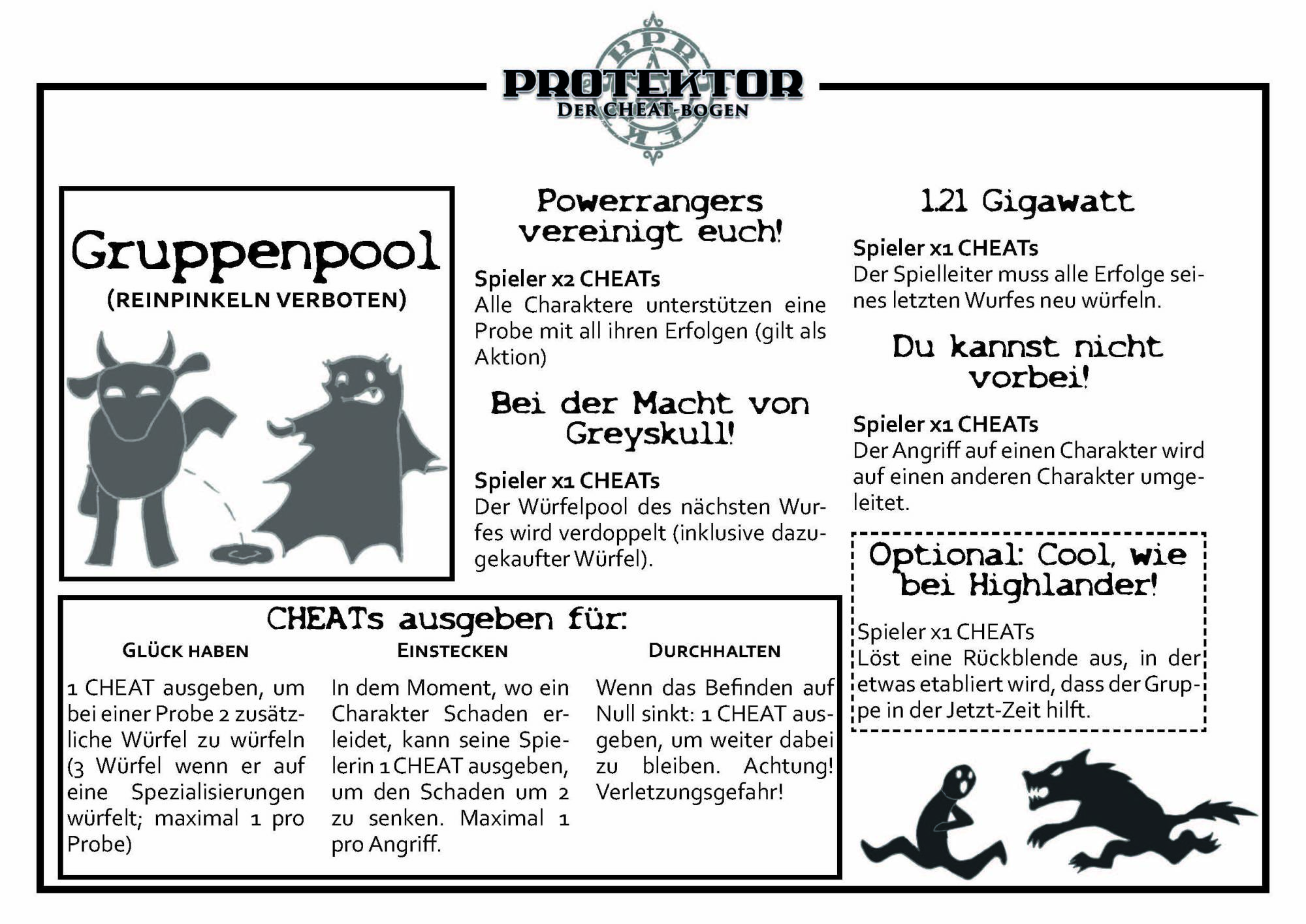 Die ausgegebenen CHEATs (klassische Gummipunkte, mit denen sich die Charaktere z.B. mehr Würfel erarbeiten können) sind nicht einfach weg, sondern werden in einem Gruppenpool gesammelt, aus dem die Gruppe dann Gruppenaktionen aktivieren kann.