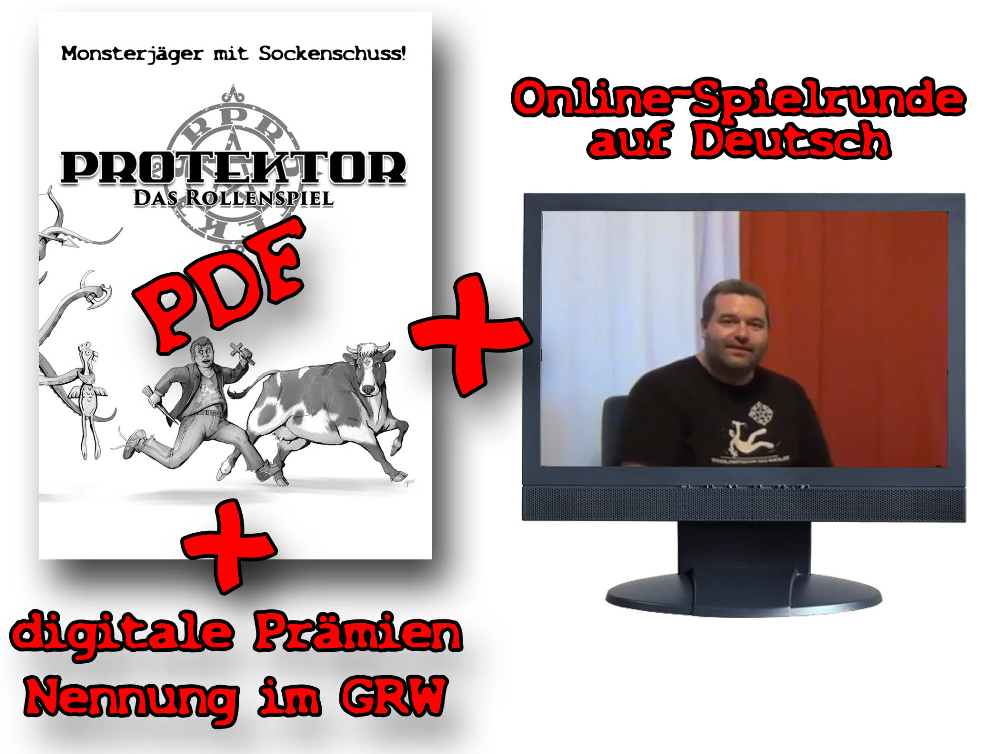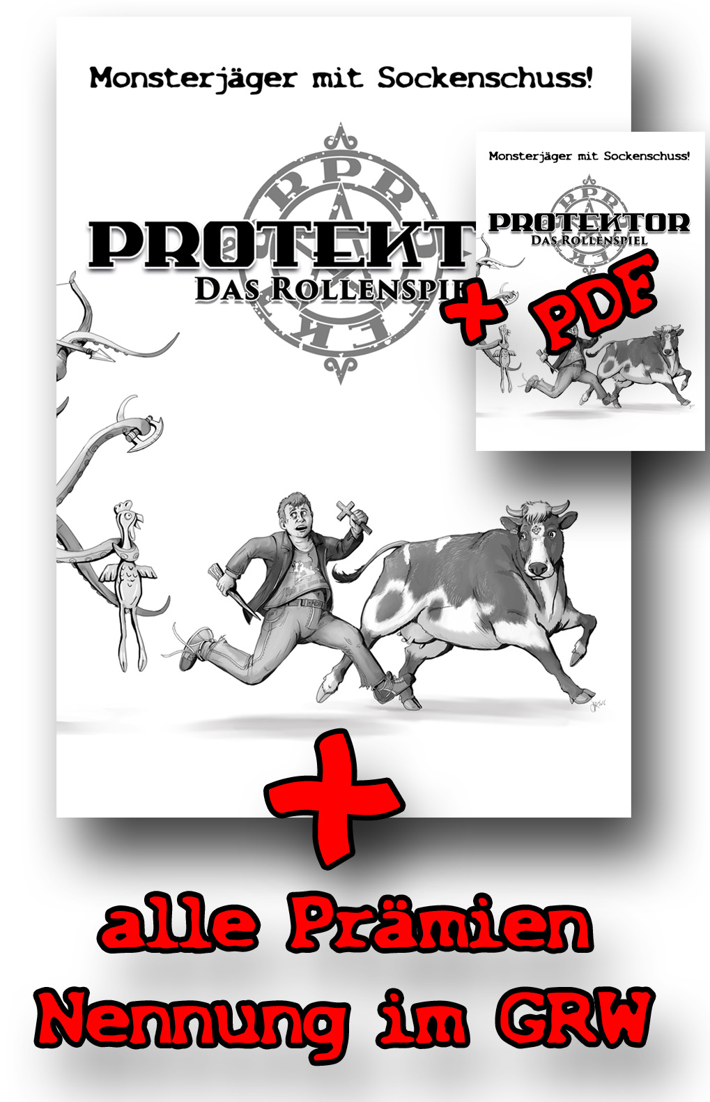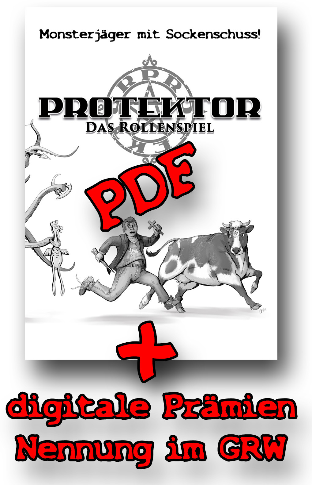Bei Protektor schlüpft ihr in die Rolle des Protektors, seines Tiergefährten (Spiel eine Kuh! Einen Guppy! Einen Wellensittich! Einen Frosch!) oder einer seiner Begleiterinnen. Gemeinsam bildet ihr eine Monsterjägertruppe, wie sie niemals den Weg in eine ehrwürdige Sage oder auch nur ein Geschichtsbuch für Monsterjäger der ersten Vorschulklasse gefunden hätte. Denn bei Protektor geht es nicht darum, Helden zu spielen, sondern mehr oder weniger normale Leute, die da eher so aus Versehen reingeschlittert sind und bei denen ziemlich viel schief geht. Ihr rettet trotzdem die Welt – aber ihr seht dabei weniger aus wie Constantin oder Herkules, sondern wie Mr. Bean oder die Scooby Gang. Kurzum: Protektor ist ein lustiges Rollenspiel über verpeilte Monsterjäger, das viel Wert auf Klischees legt.