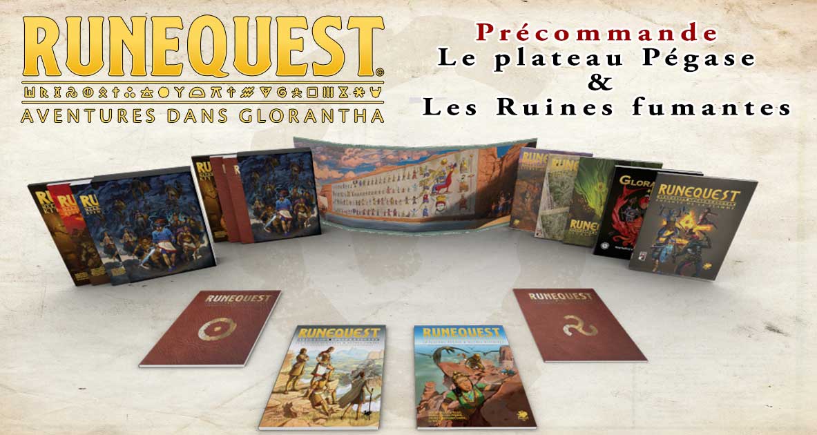 Toute l'équipe a le plaisir de vous proposer en précommande les superbes suppléments pour RuneQuest : Aventures dans Glorantha : "Les Ruines fumantes & autres contes" et "Le Plateau Pégase & autres histoires".