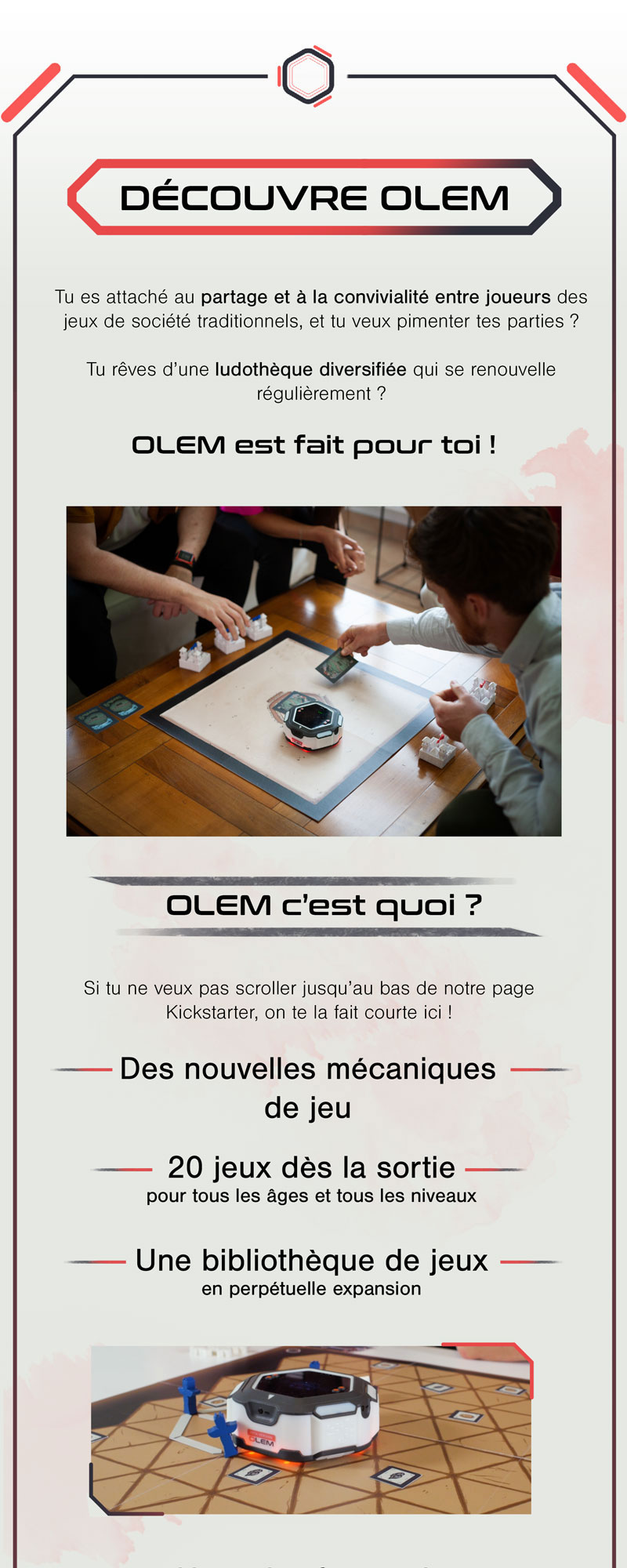 Oui, nous prévoyons de continuer à créer des nouveaux jeux après la sortie d’OLEM. De plus, il y aura également des nouveaux jeux créés par la communauté puisque tous les détenteurs d’OLEM auront accès aux outils de création de jeux. Oui ! Nous travaillons sur des outils de création de jeux qui seront disponibles à tous les détenteurs d’OLEM. Tu peux consulter la section “Créer votre propre jeu” pour en savoir plus. Actuellement, nous estimons qu’il sera possible de jouer 8 heures avec OLEM. Cette valeur peut varier en fonction des jeux mais restera toujours supérieure à 6 heures. Les backers du Core Pack recevront 10 jeux avec OLEM. Les backers du Premium Pack recevront 15 jeux. Cependant, dès la sortie, 20 jeux seront disponibles au téléchargement sur la ludothèque digitale. Parmi les jeux supplémentaires, certains seront gratuits, d’autres seront payants. Oui ! Pour l’obtenir, il faut nous envoyer un mail ou un message directement via Game on Tabletop et nous t’enverrons une facture.