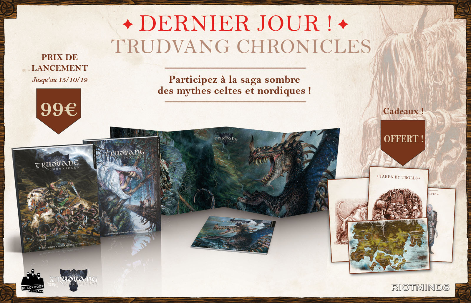 Toute l'équipe de Black Book Editions est heureuse de vous proposer cette précommande participative pour le jeu de rôle suédois Trudvang Chronicles publié en suédois et en anglais par notre partenaire Riotminds. Alors que le rythme de livraison de nos PP s'accélère (voir à ce sujet notre FAQ en bas de page), nous sommes heureux de pouvoir enfin vous présenter cette gamme, sublime par ses visuels et son univers de fantasy inspirés, profonds et fascinants.